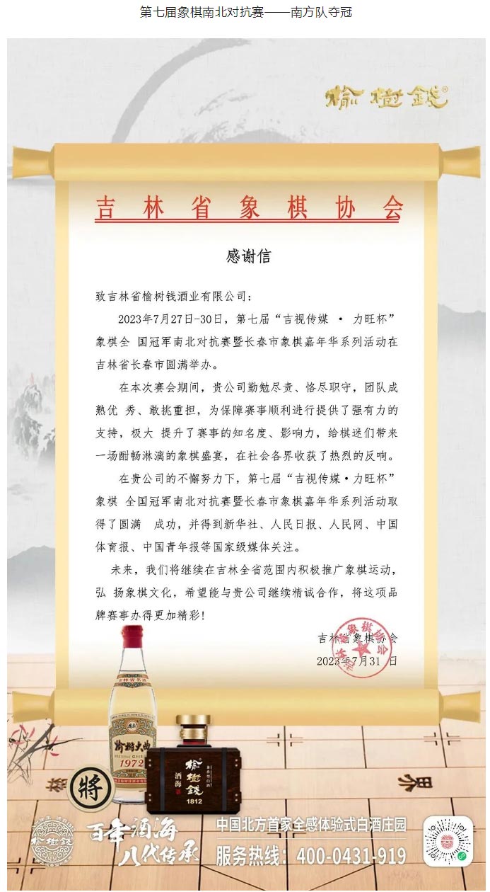 榆樹錢酒業(yè)恭賀象棋南北對抗賽圓滿落幕